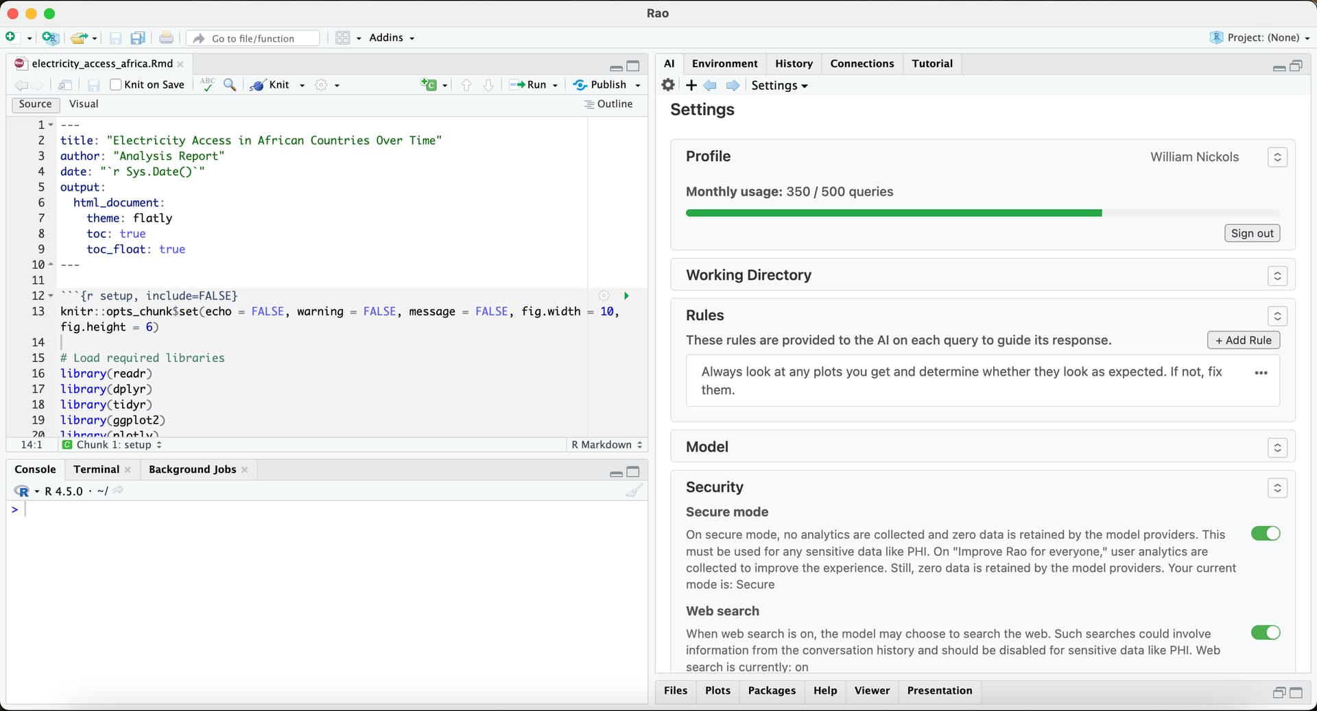 Tools -> Global Options -> Enable automatic updates. - Demo datasets. We’ve included 6 demo datasets in the Rao GitHub that you can try out to get started. Topics range from a metagenomic analysis of Crohn’s Disease and Ulcerative Colitis to comparing energy access across African countries. Each demo only takes 1-2 queries.